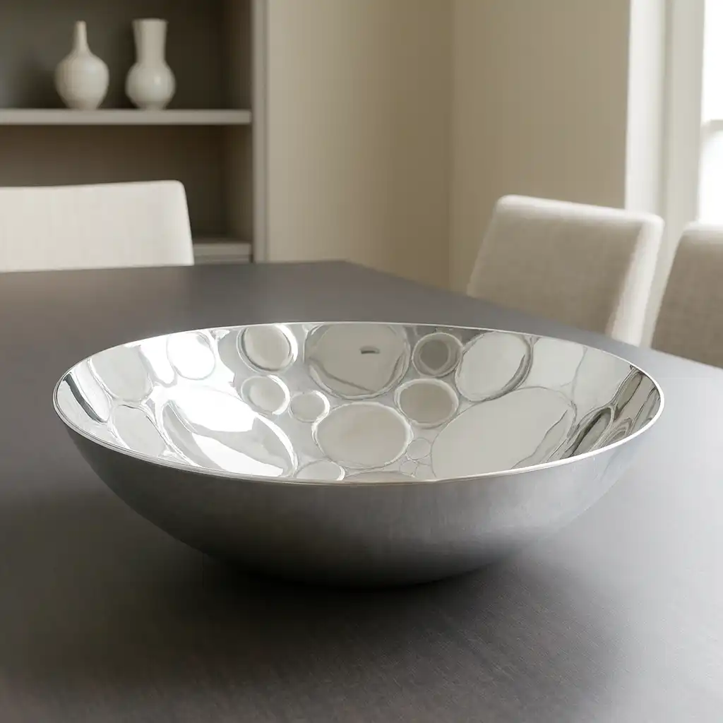 Ésta elegante y brillante pieza de servicio y decoración está hecha de pewter, por artesanos Mexicanos, Es necesario que sea lavado con esponja y jabón para posteriormente secarlo con paño o microfibra. Libre de plomo.
